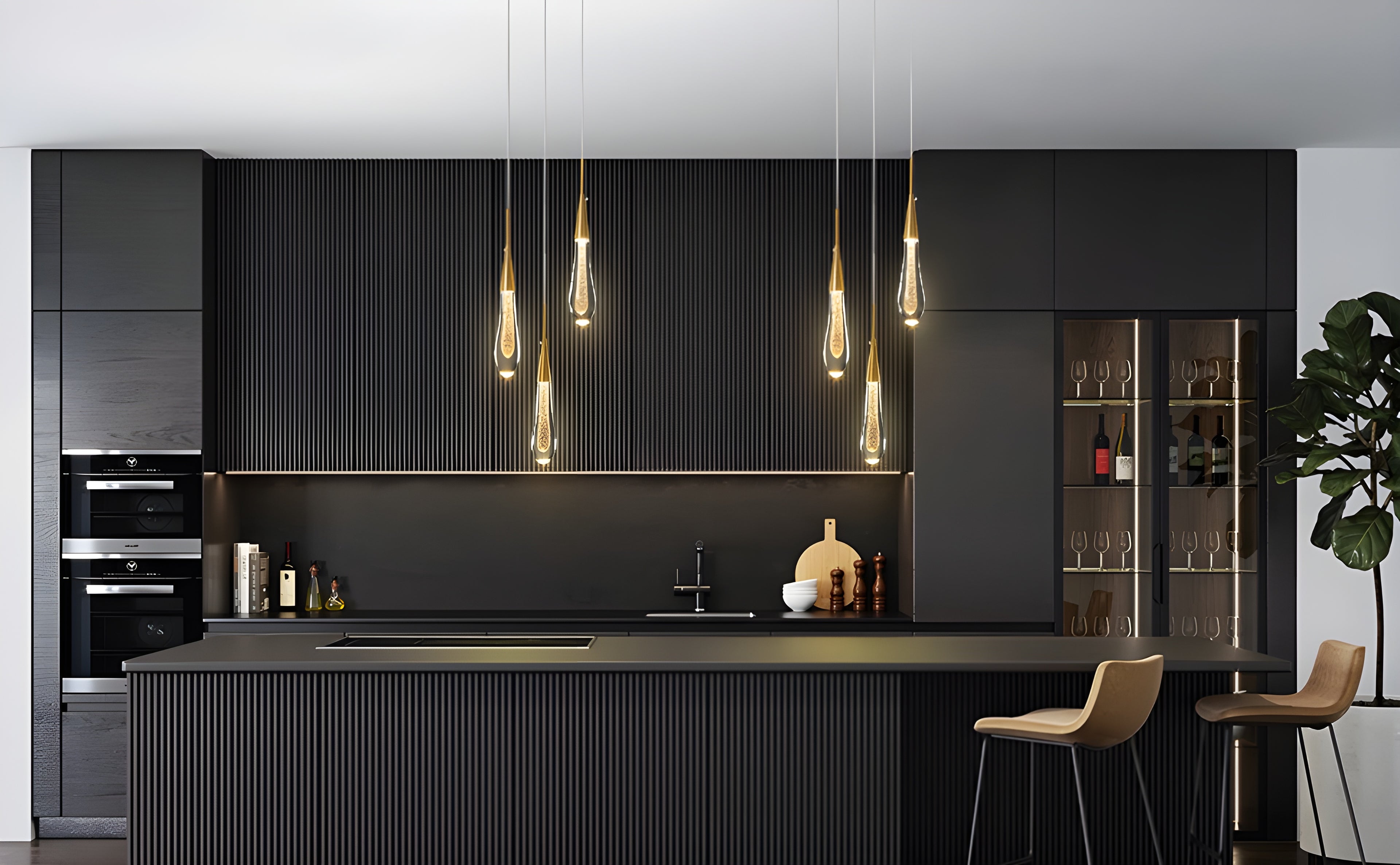 This fixture features a solid crystal drop with delicate air bubbles that catch and soften the light. Up close, the glass is clear and smooth, creating a clean, modern look that adds depth and sparkle without feeling overwhelming.
